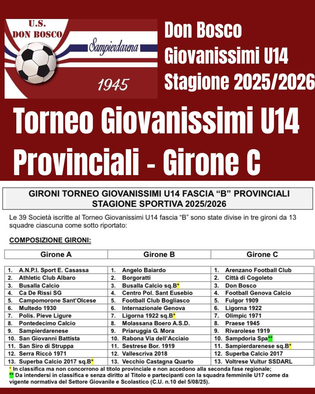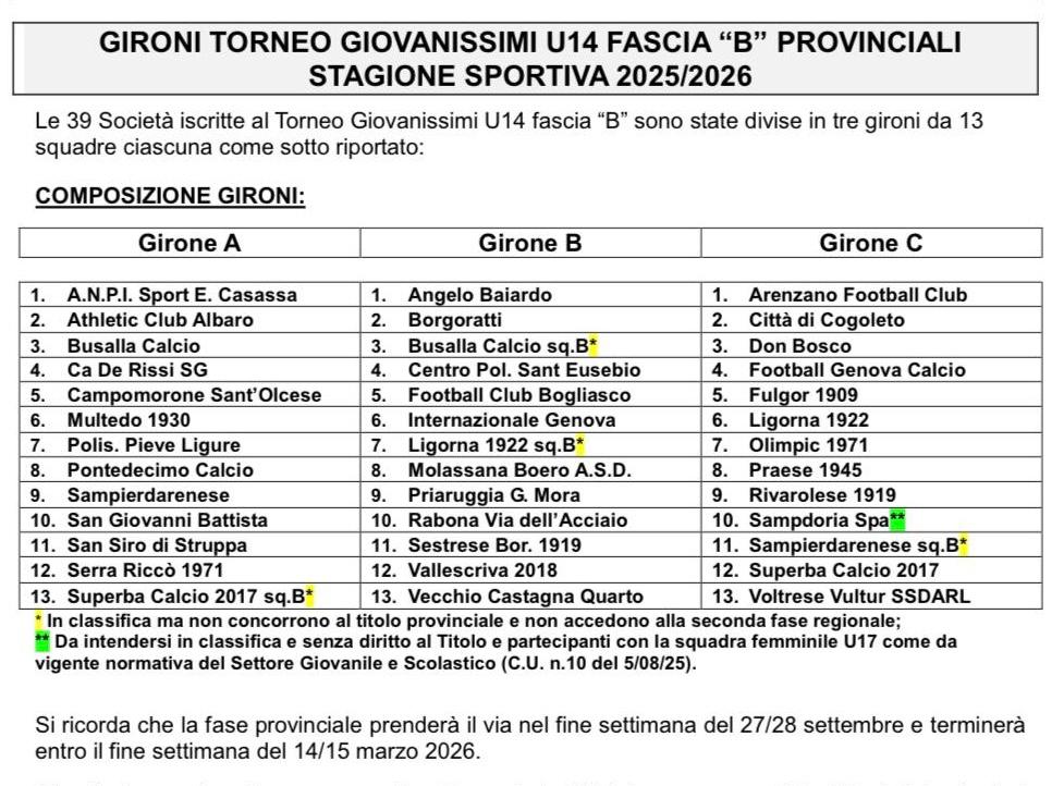 Con Comunicato Ufficiale N° 11 del 19/09/2025 la LND Genova ha pubblicato la composizione dei Gironi del “Torneo Giovanissimi U14 fascia B Provinciali”.