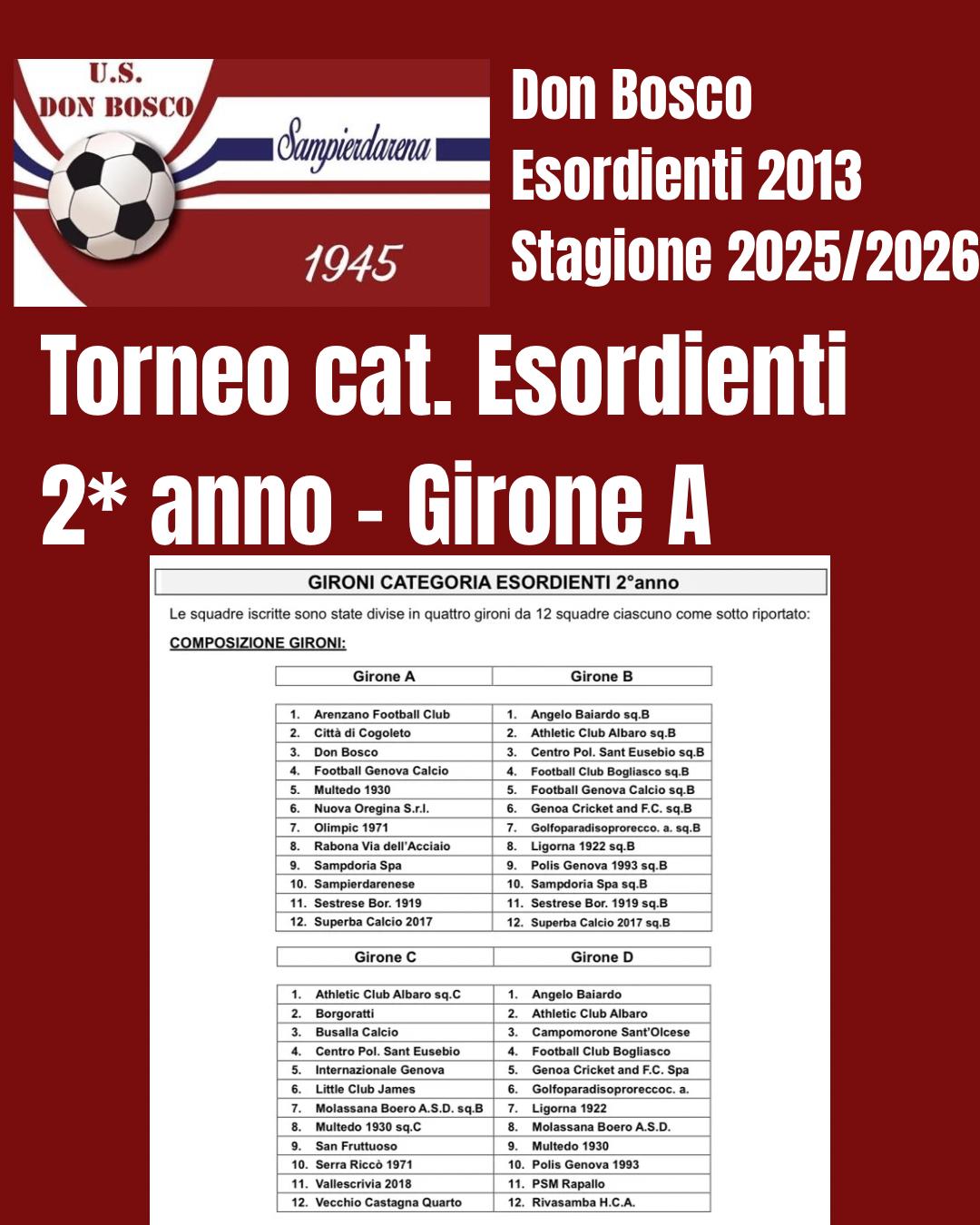 La squadra Esordienti 2° anno (leva 2013) dell’U.S. Don Bosco è inserita nel Girone “A” (12 squadre).