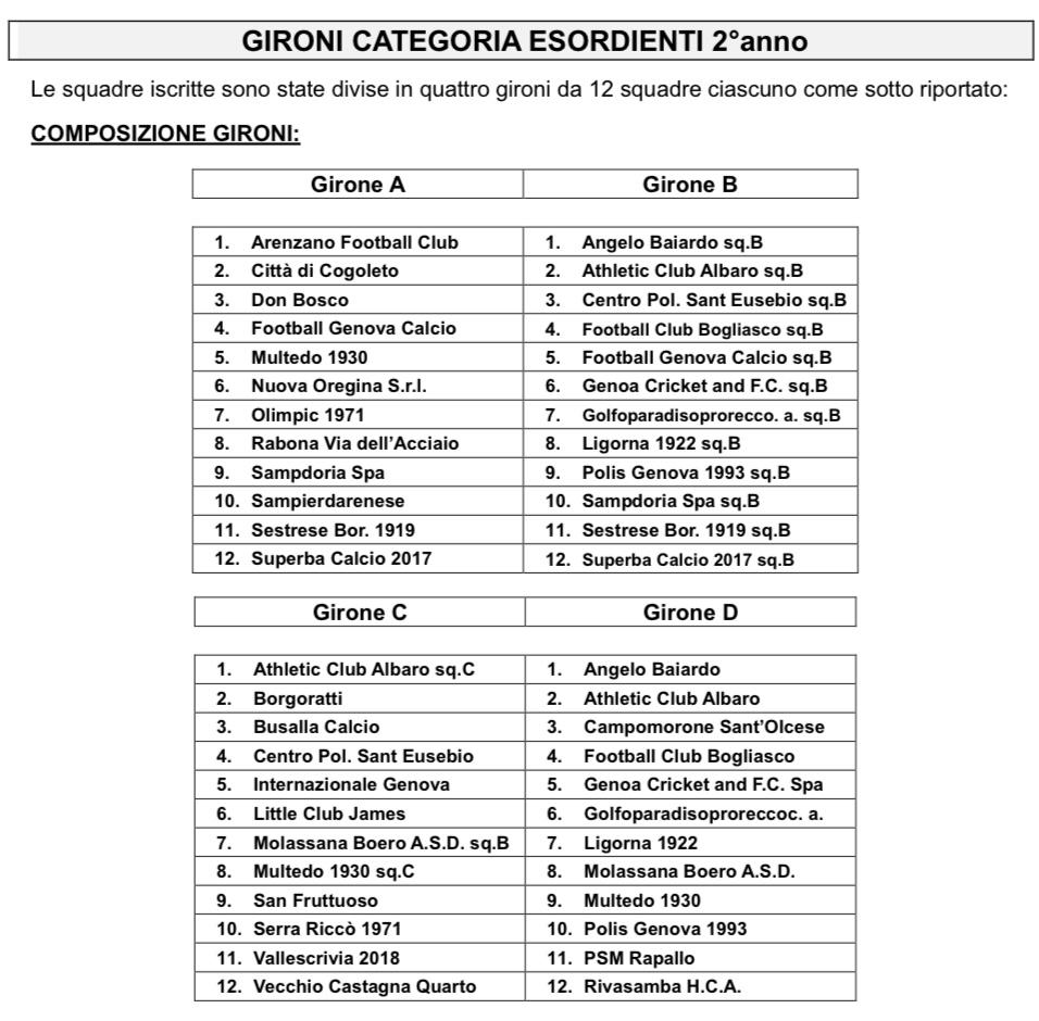 LND Genova (vd. Comunicato Ufficiale N° 16 del 06/10/2025) hanno pubblicato la composizione dei Gironi della categoria Esordienti 2° anno.