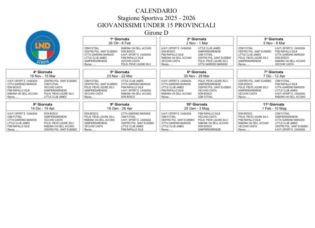 Clicca sul link o sull’immagine per scaricare il pdf del Calendario del Campionato Giovanissimi U15 Provinciali (Gir. D) – stagione 2025/2026.