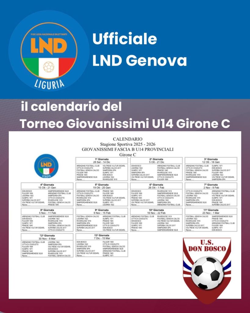 Tags:1945, 2025, 2025/2026, 80, 80annidipassione, 80vogliadidonbosco, andata, campionato, classifica, don bosco, donboscocalcio, genova, giovanissimi, gironeC, infrasettimanale, instagram, liguria, lnd, provinciali, risultati, sampierdarena, settoregiovanile, torneo, U14, Under 14