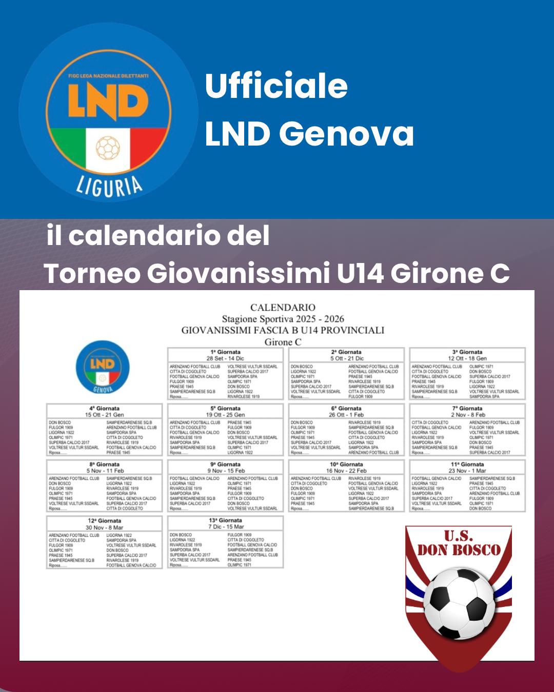 Il Calendario del Torneo Giovanissimi Under 14 fascia “B” Prov. (Gir. C) – stagione 2025/2026.