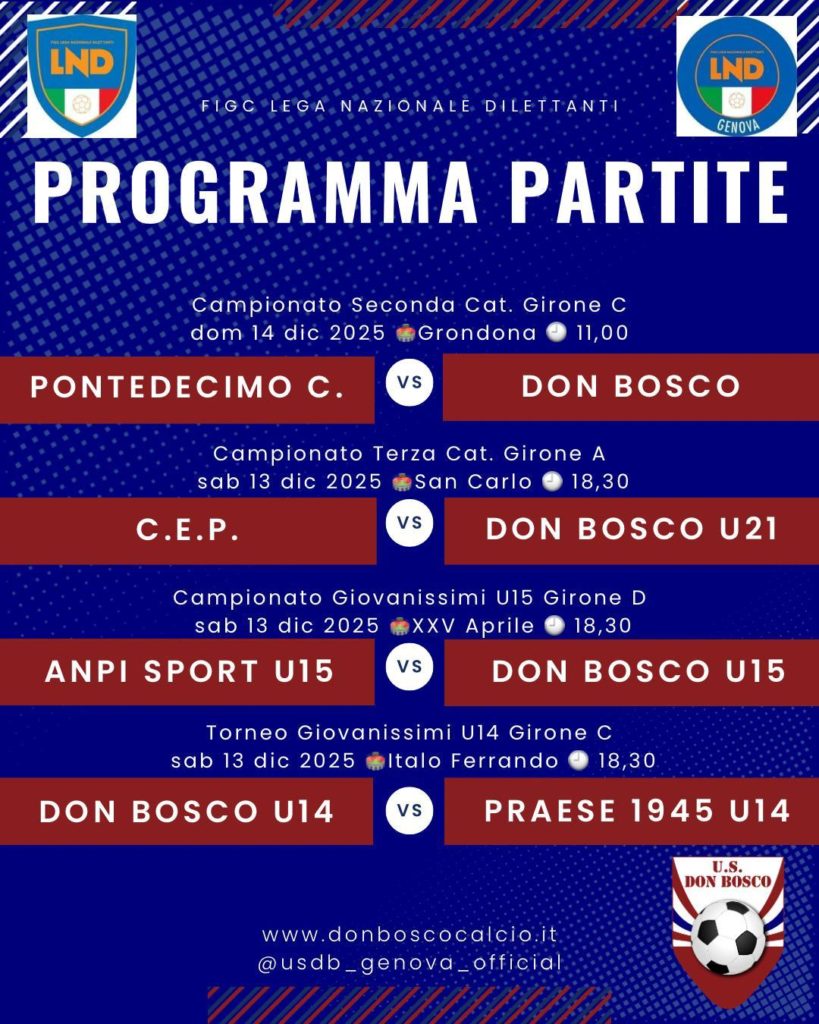 Tags:1945, 2025, 2025/2026, campionato, don bosco, donboscocalcio, genova, giovanissimi, gironeA, gironeC, gironeD, instagram, liguria, lnd, primasquadra, provinciali, risultati, sampierdarena, seconda, settoregiovanile, terza, torneo, U14, U15, U21, Under 14, Under 15, Under 21