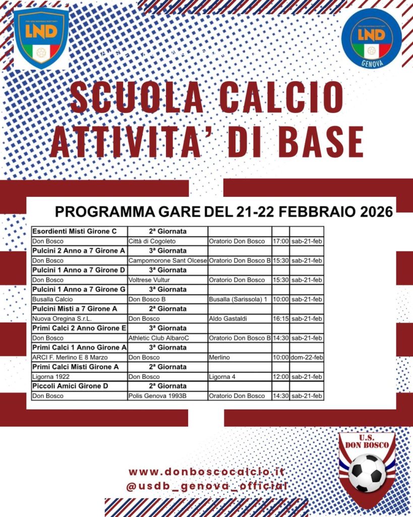 Tags:1945, 2013, 2015, 2016, 2017, 2018, 2019, 2020, 2025/2026, 2026, 80, 80annidipassione, 80vogliadidonbosco, attivitàdibase, don bosco, donboscocalcio, esordienti, genova, instagram, lnd, misti, piccoliamici, primicalci, pulcini, sampierdarena, scuolacalcio, tornei, torneifigc