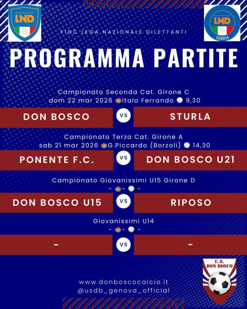 Tags:1945, 2025/2026, 2026, campionato, don bosco, donboscocalcio, genova, giovanissimi, gironeA, gironeC, gironeD, instagram, liguria, lnd, primasquadra, programma, provinciali, riposo, sampierdarena, seconda, settoregiovanile, terza, torneo, U14, U15, U21, Under 14, Under 15, Under 21