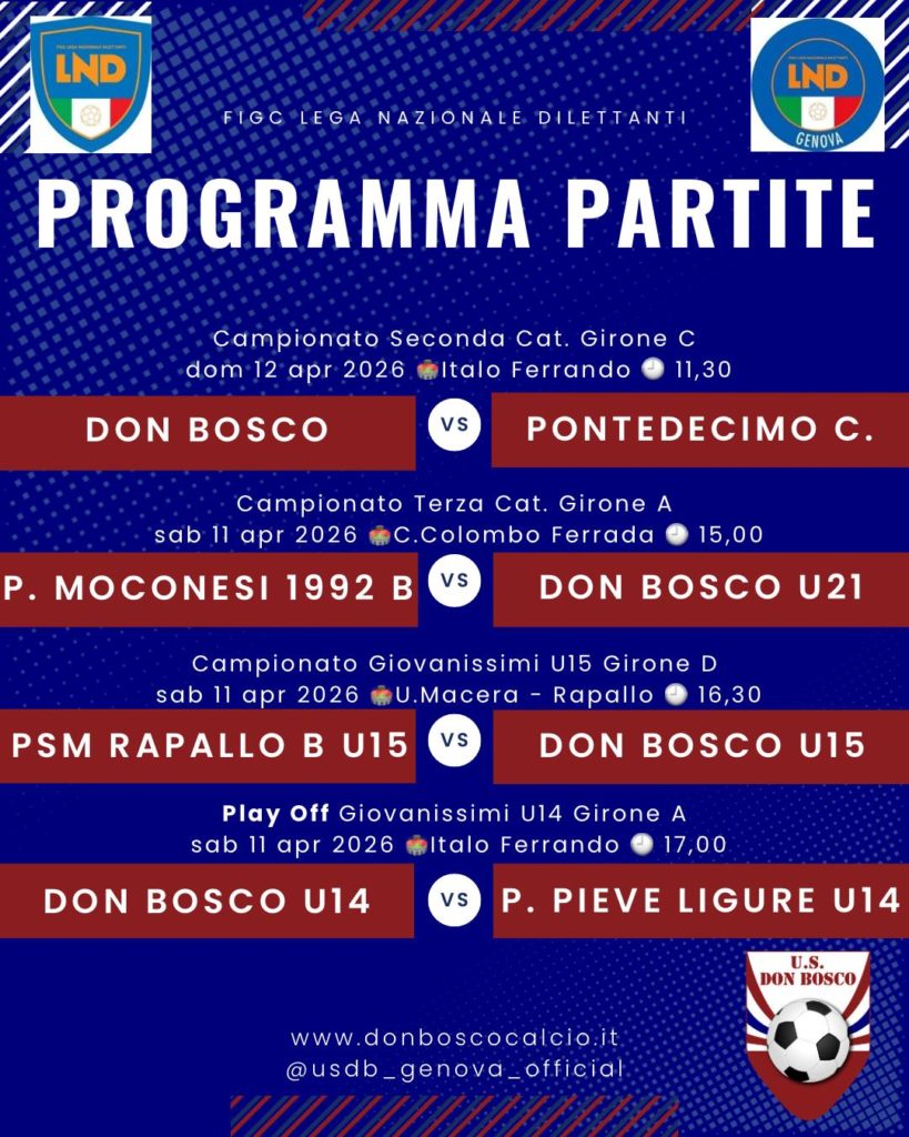Tags:1945, 2025/2026, 2026, campionato, don bosco, donboscocalcio, genova, giovanissimi, gironeA, gironeC, gironeD, instagram, liguria, lnd, playoff, primasquadra, programma, provinciali, sampierdarena, seconda, settoregiovanile, terza, torneo, U14, U15, U21, Under 14, Under 15, Under 21