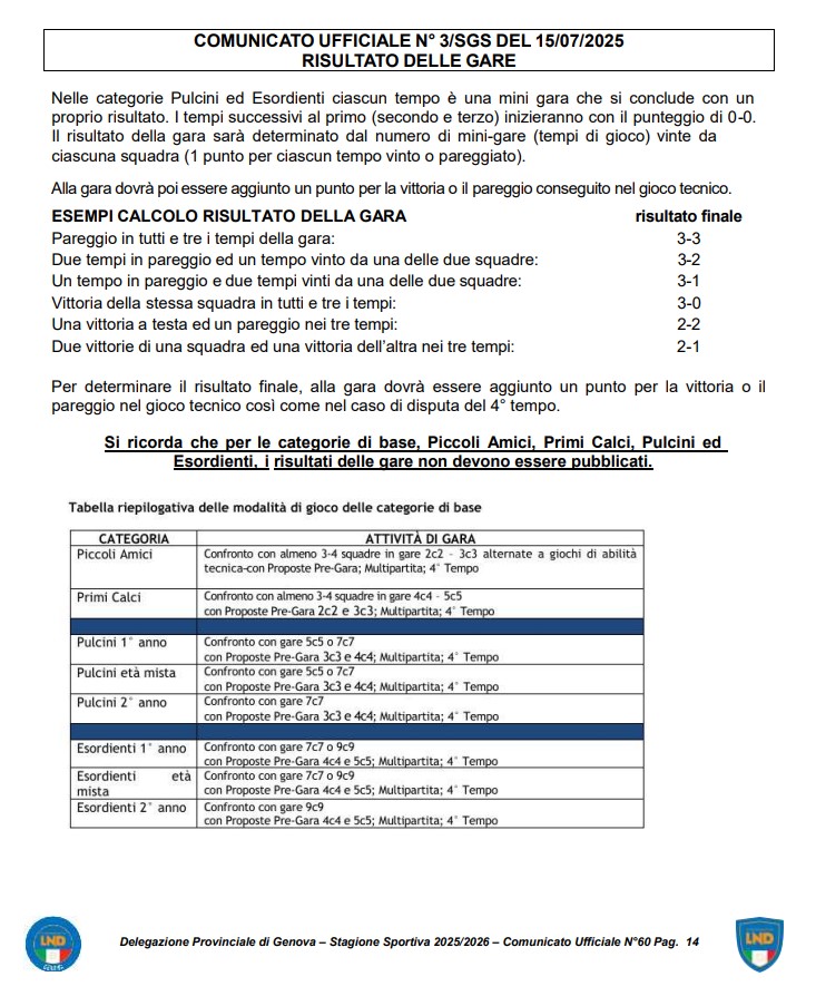 Pubblichiamo di seguito la nota che fa riferimento al Comunicato Ufficiale N.° 3/SGS del 15/07/2025 della Federazione Italiana Giuoco Calcio – Settore Giovanile e Scolastico, nella quale si cita testualmente: “Si ricorda che per le categorie di base Piccoli Amici, Primi Calci, Pulcini ed Esordienti, i risultati delle gare non devono essere pubblicati”.